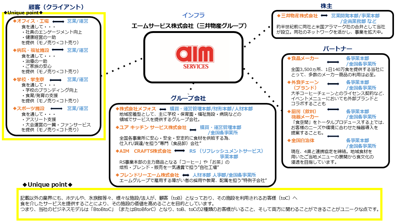 「エームサービス」という社名は、聞き馴染みないかもしれませんが、「食」で日本の未来を支えている食のインフラ企業です。あらゆる場所であらゆる年代の方に向けて食を介したサポートを行っています。食を切り口に、今はない新たな「当たり前」を創ることに興味がある方、お待ちしています。