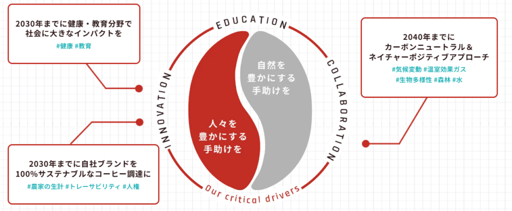 気候変動や生物多様性の課題に対応するため、2040年までに「カーボンニュートラルの実現」や「ネイチャーポジティブアプローチ」を推進するとともに、2030年までに自社ブランドのコーヒーを「100%サステナブルに調達すること」を目標としています。