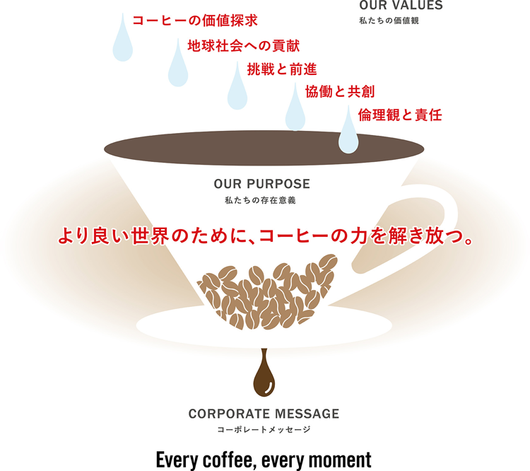 「カップから農園まで」の考えのもと、コーヒー豆の生産からお客様に提供する一杯のコーヒーに至るまで、より良い世界のために、コーヒーを通じた価値創造に挑戦し続けます。